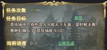 国家任务的主界面就是这样了,首先我们要看清楚任务目标是什么,比如图中的任务是竞技场战斗一次。