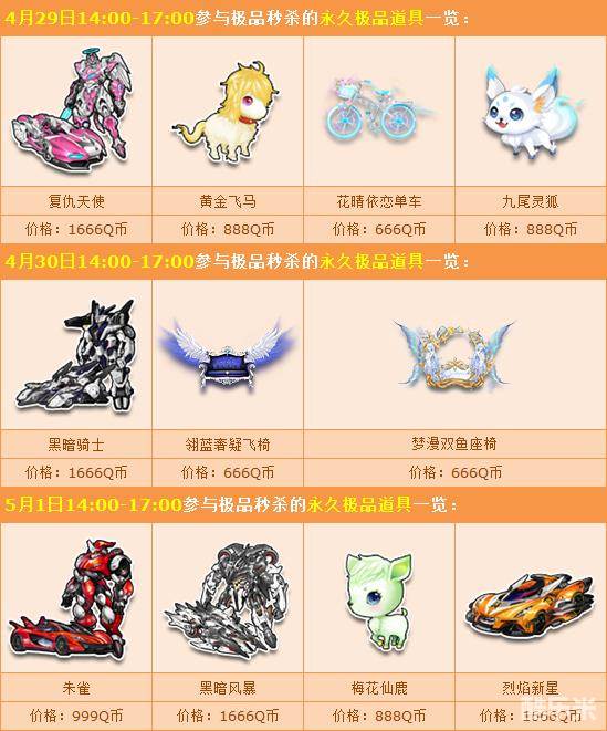 4月29日-5月1日期间每天14:00-17:00,极品秒杀惊喜开启,一系列永久极品开放限量秒杀,千万不要错过哦!