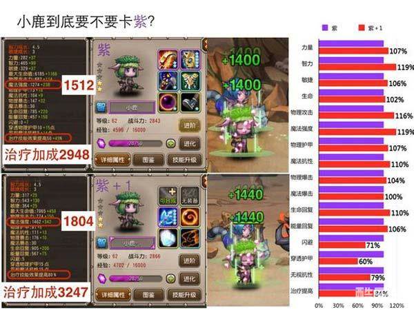 2、随着小鹿的大的治疗量的增加(每级5点),紫0会比紫1多出15%治疗加成,如果等级、星级提升,紫0小鹿的治疗量势必反超紫1。