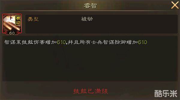 评价:此技能可以加成至神算阵法,既加智谋伤害,又加成护盾伤害量吸收,以抵消敌军士兵伤害。其次,智谋防御增加还能提升士兵对敌将技能抗性,进一步增强了诸葛亮部队的硬度。