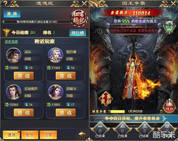 除了上述内容,游戏还有其它有趣的内容,比如拥有红名规则的遭遇战和国王争霸等等。所谓的遭遇战其实就是一场路人大乱斗,玩家每杀掉一位路人可获得一定的积分,积分最多的4位玩家将登上排行榜,可有较大的机会获得珍贵的红名宝箱。而国王争霸则是势力内部的一场权力争斗,在这场争斗中获得最终胜利的玩家将成为所在势力的国王。成为国王后,玩家可以享受势力内的最大福利,拥有分配大量资源的权力。