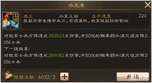 评价:220的出手速度不慢,技能特效可强可弱。若是触发了特效,水龙卷这个技能又恰好能攻击到敌军士兵多的大方阵中,这个技能可以说威力无穷;如果只打到士兵少的小方阵中,该技能的特效就失去了意义。太看脸,实战能力其实不强,但有一定的惊喜点。