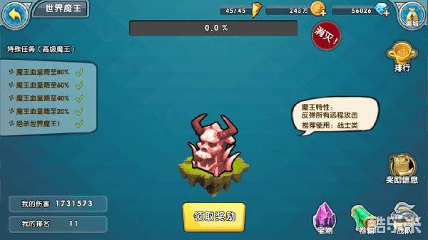 有一个小细节:魔王的冷却时间,如果你们不想等可以用钻石重置时间哦,用钻石就可以直接打了呢~