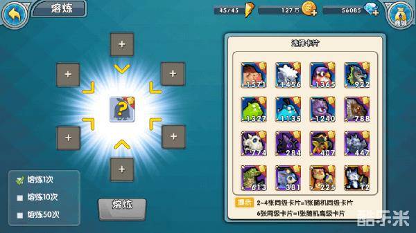 熔炼:需要选择卡片,可以熔炼出同级卡片,高级卡片