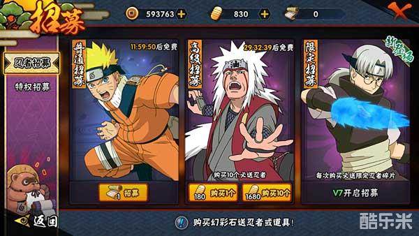 最后一个级别的招募需要特权V7才可以进行,每次招募必得限定忍者碎片,这也是获得限定忍者最有效最快速的方法。