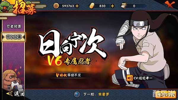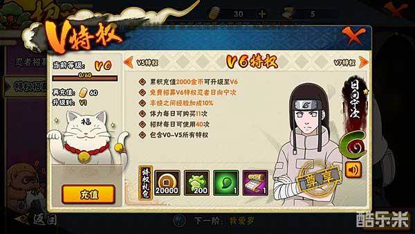 累积充值2000金币可以升级到V6,除可以获得日向宁次外还可以获得丰饶之间经验加成等特权。对于喜欢宁次这名忍者的玩家来说是非常值的。
