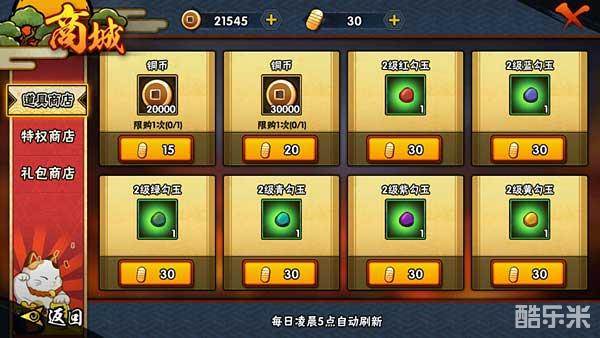 道具商店顾名思义,其中售卖的都是游戏中非常实用的道具,这里说的道具就包括了铜币;红、蓝、绿、青、紫、黄各种颜色的勾玉。另外需要注意的是铜币的购买量是有限制的,20000铜币和30000铜币在刷新前的购买量限制都是1次。而道具商店在每日凌晨5点自动刷新。游戏前期如果我们一直跟着进度对装备进行升级进阶,可能会存在铜币不够用的情况,这种情况下我们就可以每天在道具商店购买铜币(每日最高可达5万铜币)来进行缓解。