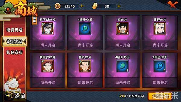 特权商店里销售的都是相对来说更强大的道具。从图中我们看到特权商店中可以直接购买忍者碎片和高达4级的勾玉。这对于我们获得忍者和强化忍者都是非常有用的。当然特权商店需要V10以上才可以开启,开启的时限是永久。如果我们想快速获得忍者和高级勾玉可以选择充值V10来开启特权商店。