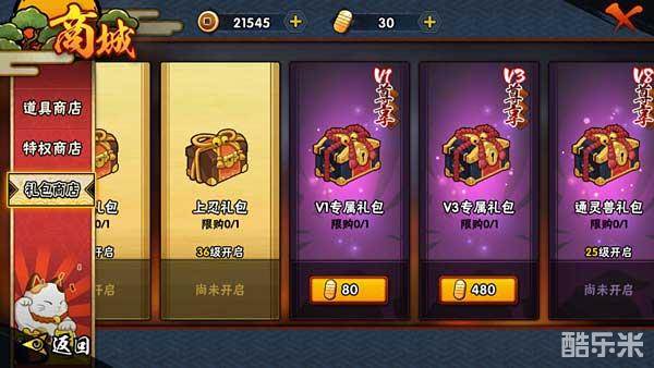 以上两种商店(道具商店、特权商店)都是需要用金币来购买或充值金币获得特权来开启的。而在礼包商店中,我们可以通过达到一定的等级开启下忍、中忍、上忍的礼包,除等级礼包外,还有V1、V3的专属礼包。玩家达到25级以后还可以开启通灵兽礼包。当然这些礼包也都是限购1个的。