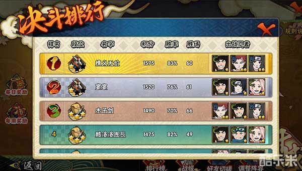 在决斗场的排行榜页面里面可以查看当前服务器,积分和段位最高的前100名玩家,可以看见胜率胜场和出战的忍者。在这里可以通过这些高手们的出战忍者来了解到哪些忍者比较受欢迎,比较厉害,可以根据自己的需要来学习下高手们的选择。一套好的出战忍者阵型,对于我们提升段位是有很大帮助的。