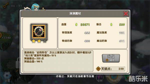 深渊魔杖:直接拖动“史诗形态”及以上家族加入战队时,额外增加3步;“战士类”家族所有属性+15%;英雄暴击+300点;英雄血量+150%