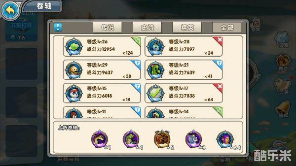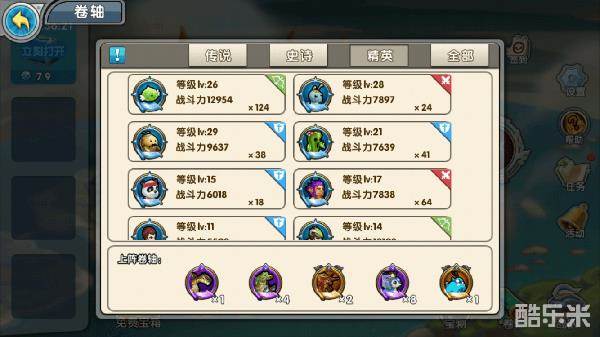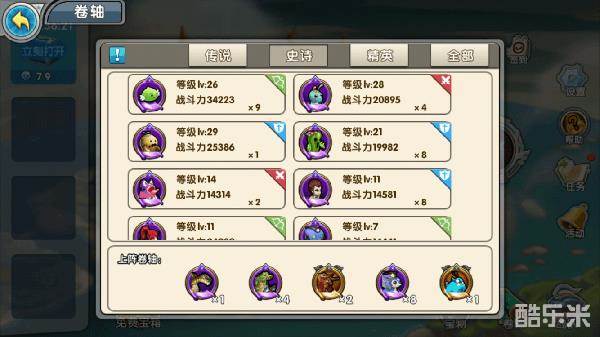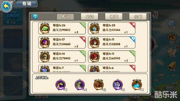 每个卷轴相对应的有:等级、战斗力和右下角的个数