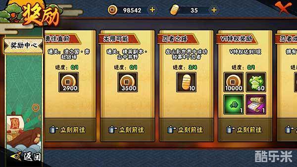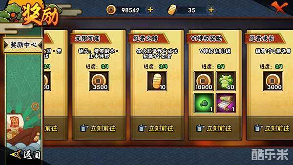 我们看到,在奖励面板中,主要是V等级、拥有N星忍者、招募忍者数量、精英副本的通关、普通剧情的通关这类的任务。