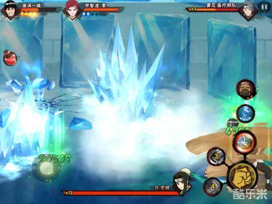 在刷出两波小怪之后,觉醒白便会出现。她未出场时便会释放一个像千杀水翔一样的忍术,全屏结出冰柱,持续一断时间爆炸。这里建议大家在冰柱出现的第一时间找好位置,不要随意走动。因为冰柱会爆炸、碰到也会掉血。找好位置站定便好。