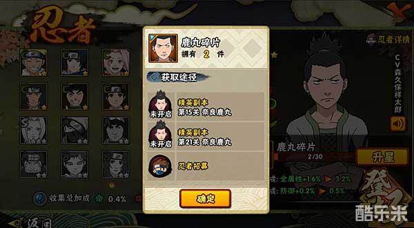 鹿丸的获取方法最简单,新服连续7天登陆就可以获得,升星相对比较困难,除了招募之外,只能通过精英副本获取升星碎片,并且精英副本需要打到第15关和21关,基本上需要玩家等级到达40多级以上。从难度上可以看出鹿丸属于很强力的忍者,需要到游戏后期才能通过副本获得,连续7天的登陆活动,可以让我们早早的拥有这名忍者。