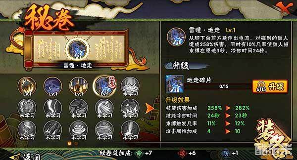 雷遁·地走:从脚下向前方延伸出电流,对碰到的敌人造成伤害,同时有10%的几率使敌人被束缚在原地3秒,冷却时间是24秒,附加额外攻击属性。