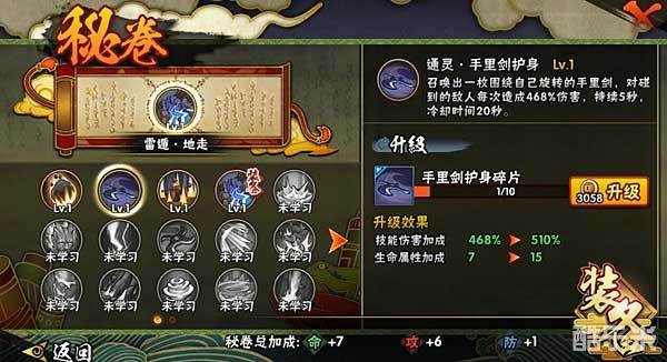 通灵·手里剑护身:召唤出一枚围绕自己旋转的手里剑,对碰到的敌人每次造成伤害,持续5秒,冷却时间20秒,附加额外的生命属性。这个忍术是个人比较喜欢的一个忍术,召唤出的手里剑可以持续对身边的敌人造成伤害。适合近身战的忍者使用,可以增加很多的伤害和连击数。在冲锋和准备近身战斗的时候开启,可以起到很好的辅助输出的作用,效果还不错哦。