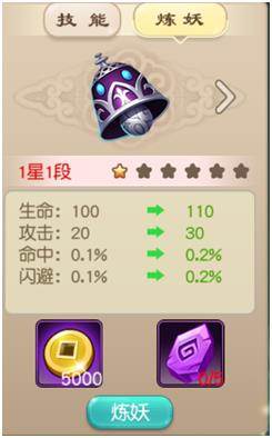 当玩家等级达到27级会开启“炼妖”系统,炼妖消耗金币、炼妖石、飞升石和妖灵碎片,可以大幅提升妖灵的高阶属性,比如闪避、暴击、命中等,作为游戏中不多的提升高阶属性的地方,会在游戏中后期对战斗结果产生巨大影响,当你已经是一个久经沙场的老司机时一定不要忘记提升妖灵的炼妖等级哦!