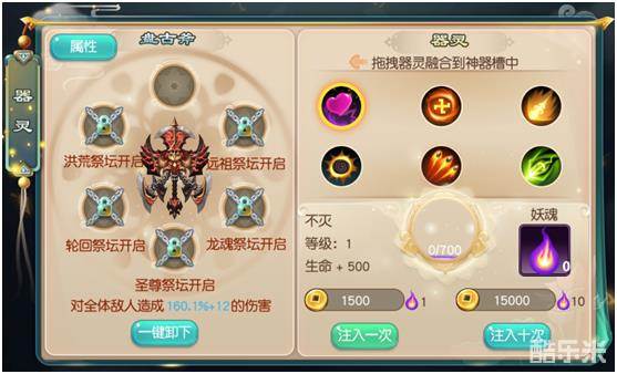每个神器可以镶嵌多个器灵,器灵会大幅提升主角属性,升级器灵需要消耗妖魂和金币,器灵提升的战斗力将在游戏中后期对使主角得到提升。