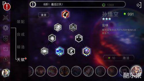 天赋圣石方面,1星建议点蛮横,增强前期作战能力,2星建议点伺机而动,提升逃生能力,3星建议点危机边缘,提升伤害输出。圣石方面,孙悟空前期需要打伤害,所以圣石选择方面偏输出。