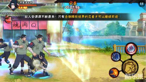 忍者在施展结界的时候不会攻击和移动,因此只要注意走位,保证能够在攻击中击中所有的忍者就能解决战斗,结界忍者共有六管血条,佐助的奥义千鸟加上一个小技能就能干掉他,打破结界之后前进几步就能通过本关。