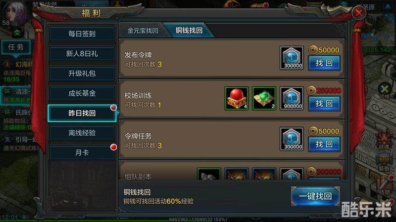 如果错过了活动的时间,又想找回活动奖励的话,可以运用福利按钮下面的“昨日找回”功能。利用铜钱或者金元宝找回昨日的经验奖励和活动道具奖励。铜钱的找回率为60%,而金元宝的找回率为100%。