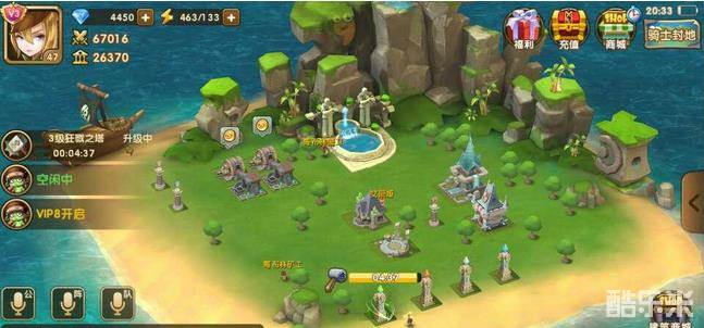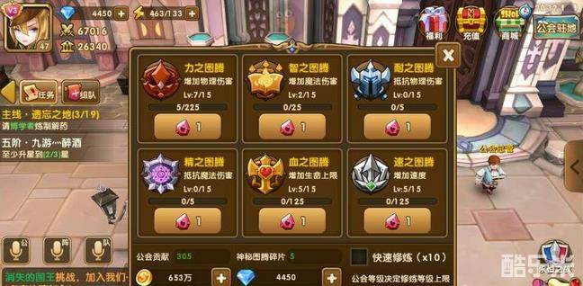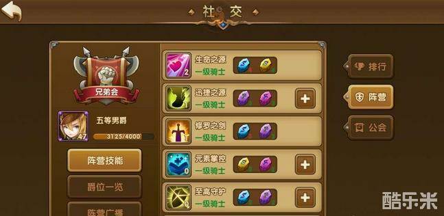 社交系统主要分为阵营和公会两大块。阵营就是在玩家加入公会前必须选择的,分为骑士团和兄弟会两大阵营,不同阵营在PVP地图上可以进行PK,同时通过每天做阵营任务可以提升玩家的爵位,而爵位提高才能不断提升玩家的领地建筑等级,从而产出更多的金币和魔石。公会系统目前主要二大玩法,一个是每天答题,另外就是图腾。每天答10道题来获得奖励,提升图腾来提升玩家战力。这里要吐槽下,升级图腾提升的战力真心低,关键花费的金币还是海量的,目前是游戏里最耗金币的,没有之一。感觉提升的战力对不起花费的金币,建议后期改改。当然公会夜晚还有个圣火的活动,通过点燃圣火在半小时内站在公会领地可以不断获得经验。