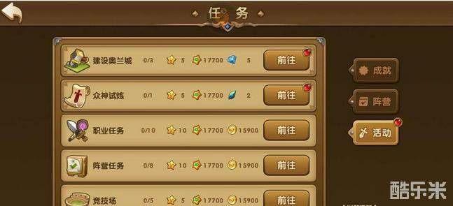 《永恒之歌》的任务系统可以说是游戏的一大特色,除了主线任务外,每天固定还有职业任务和阵营任务,建议玩家必须把这两个任务做了,因为职业任务是获得技能点的主要途径,技能点的重要性不言而喻;而阵营任务是获得战功的主要途径,通过战功提升爵位从而提升玩家的领地等级。除了这两大任务,游戏里面还有戊卫奥兰任务,也就是和玩家组队每天完成30次类似于跑环的任务,这是玩家每天升级的主要途径。当然游戏还有其他众神试炼、遗迹副本、幻境副本等任务,这些都是获得稀有道具的任务,建议玩家有条件的每天都完成。