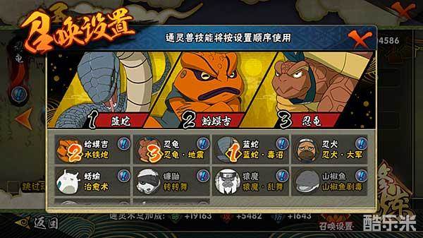 一尾漩涡鸣人的优势在于控制,伤害主要是大招。所以在通灵兽的设置上,主要是补充伤害和控制的效果。起手用蓝蛇来撞击敌人并造成持续伤害。中间用蛤蟆吉是在第一波技能CD时,控制敌人。如果操作不是很在行的话,中间位也可以选择蛞蝓,用来恢复一些血量。忍龟对于无限连的忍者是一个很好的补充,因为给了一个墙。但最好不要在墙边放,会浪费忍龟的效果。