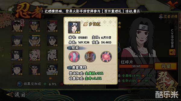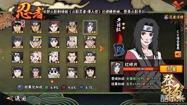 登场加成:B级忍者夕日红登场效果为全属性+4.9%,满星后全属性+12%