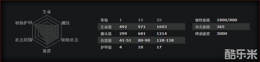 生命:492 魔法:299 护甲:4.0 力量:18(每级+1.80) 敏捷:24(每级+2.80) 智力:23(每级+2.10) 攻击力:41-51 移动速度:315 视野范围:1800/800 攻击距离:375 弹道速度:3000 攻击前摇/后摇:0.2+0.97 施法前摇/后摇:0.3+0.5 基础攻击间隔:1.7