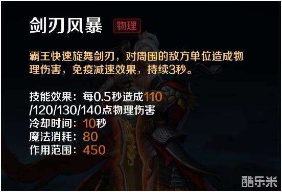 剑刃风暴,在前期,超高的输出,很容易慢慢耗死对面,最好配合剑气,让此技能打满伤害,前期很容易带走脆皮 。建议主点