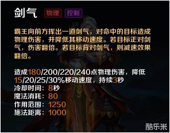 剑气,面对目标施放,会触发双倍伤害的效果,对拼时候会有意想不到的收获,前期配合剑刃风暴,很容易秒脆皮,如果对面逃跑,背对施放的话,会触发双倍减速, 满级的剑气是30%,双倍就是60%,是后期追人必备神技