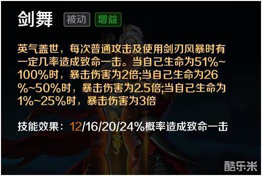 剑舞,后期AD项羽的核心技能, 强大的暴击几率和2-3倍的暴击伤害 ,配合装备秒脆皮很轻松。不过前期 没攻速 不适合先点
