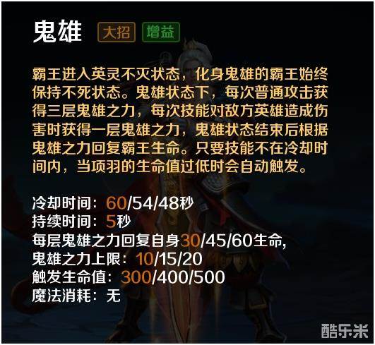鬼雄,项羽的灵魂技能,项羽的R具备无敌, 如果对面人多, 逃跑的情况下, 即使满血,也可以先放大逃跑,逃跑后还能继续在线上耗着。 对拼的情况下, 最后血越少开最好,因为开大能触发吸血效果, 如果对面控多, 就不要赌运气了, 感觉差不多就可以开大, 不然被秒就后悔了。
