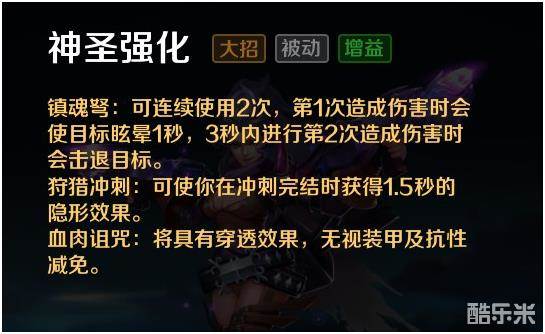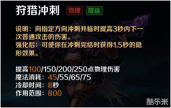 狩猎冲刺,猎魔的一个位移技能,强化后有2秒的隐身效果,这两秒很关键,可以逃跑,还可以悄无声息的切入战场。
