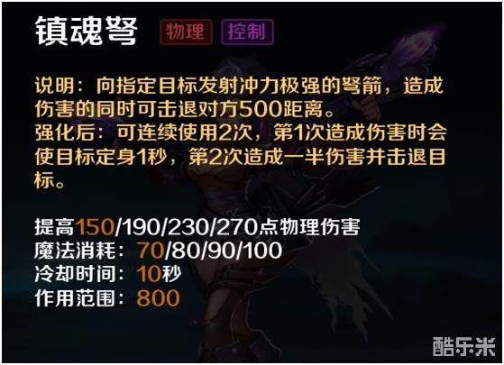 镇魂弩,是猎魔的一个控制技能,4级之后可以定身1秒,第二次是击退,4级可以先升隐身,或者是这个技能,打团的话可以先升级这个技能,帮助队友控一手,对线建议先学隐身技能,主游走的话建议先升这个技能。