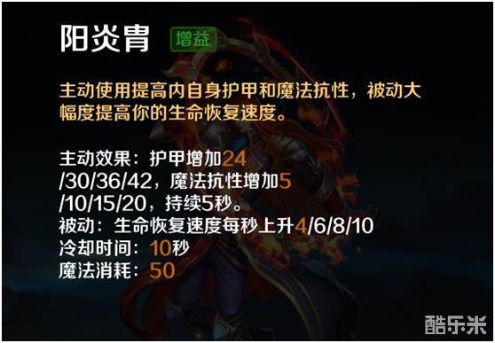 阳炎胄,主动使用提高自身护甲与魔法抗性,被动大幅提升生命回复速度。该技能奠定了半肉金乌的存在。并且大大加强了金乌的赖线能力,宜副点。