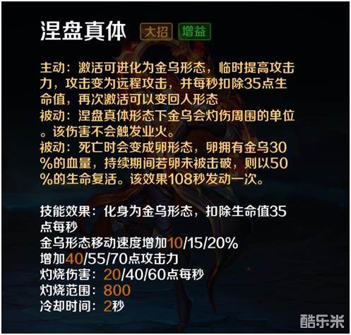 业火(被动),普通攻击与技能攻击均附带燃烧伤害。当叠满5层时眩晕敌人并爆发额外伤害。在金乌装备未成型之前叠满较为不易。前期1点足矣。