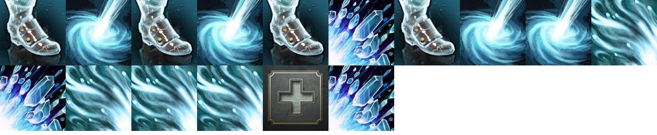 一阵极寒之风对友方英雄施加魔法,使他们接下来的数次普通攻击造成额外魔法伤害,但稍微降低攻击速度。持续30秒。