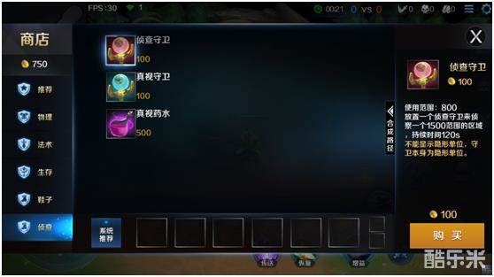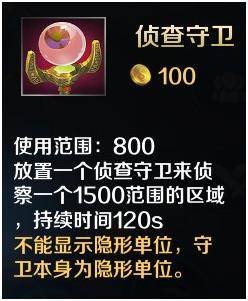 真视守卫价格100,拥有500范围的侦查视野,同时可以侦查1500范围内的隐形单位。目前游戏隐身系英雄比较少,所以经常用来排除敌方的假眼。