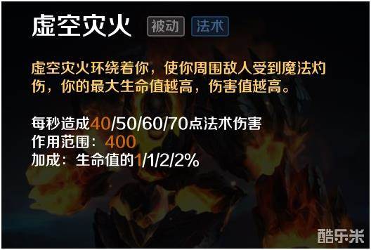 虚空灾火,地狱火核心技能,血量越高伤害越高,配合坦克的定位,对于地狱火来说有这无与伦比的性价比,在点完1技能后尽快将其点满。