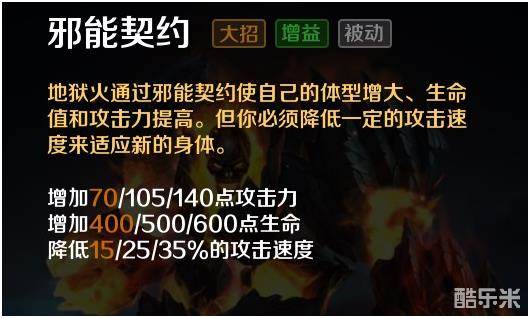 邪能契约,强力的大招,对第一,第三技能都有着加成。