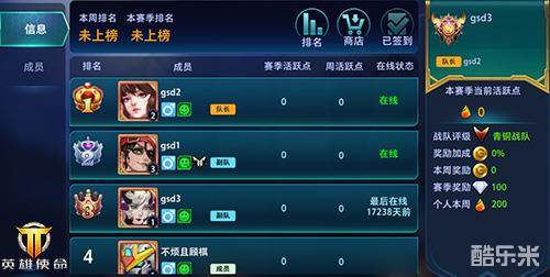 战队PK,额外加成!组队成功后的成员们在参加对战、休闲、排位的时候还可以获得金币的加成,战队人数越多,加成越高噢!还不快叫上附近好友开始一场默契无间的团队战!
