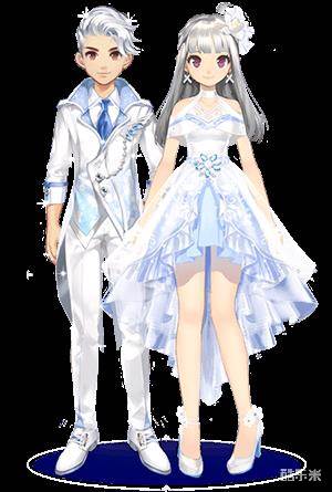 这套装名称礼服以银白色为主,蓝色作为点缀,燕尾服搭配白色西裤,具有低调而奢华的韵味。礼裙是淡蓝色不规则的长裙,时尚大气的飘逸裙摆设计,再加上淡雅的宝石点缀腰部,展现优雅魅力。