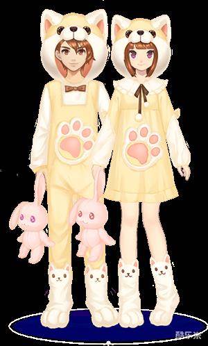 纯棉剪裁而成的睡衣与睡裙,舒适暖和。萌犬头套和胸前粉扑扑的爪印,萌动乖巧。手中可爱的粉色兔子布偶,陪你做个甜蜜好梦。