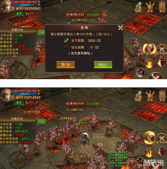 2.进入恶魔深渊后,可以进行鼓舞和效率提升,鼓舞分为金币鼓舞和钻石鼓舞,总共可以提升100%的伤害,让你在恶魔深渊里拥有整整两倍的刷怪能力!效率提升则是通过经验药水来提高练级效率,分别有1.5倍和2倍经验药水可以选择。
