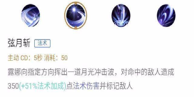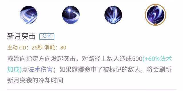 数值分析:这个技能的伤害随着等级增加提升的很快,如果是线上露娜建议主加一技能,提升露娜清理兵线的能力。