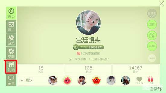 在好友的个人界面中可以看到她的资料,我们要送礼物,则点击左下角的“礼物”按钮。