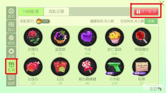 点击礼物按钮后,可以看到好友最近收到的礼物清单,我们要送礼物,只需要点击右上角的粉色按钮“送TA礼物”即可进入礼物赠送页面。